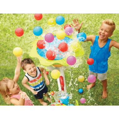 The Fun Zone Pop ‘n Splash Surprise is an interactive indoor/outdoor game that's bursting with surprise! Players take turns spinning the wheel, which tells them to step on the stomp pad, use the hand pump, or rotate the crank. As they step/pump/crank, they have a chance to trigger the Pop 'n Splash Surprise, sending water/balls flying into the air! Pulling down on the red handles resets the game for even more fun! Ages 2+.