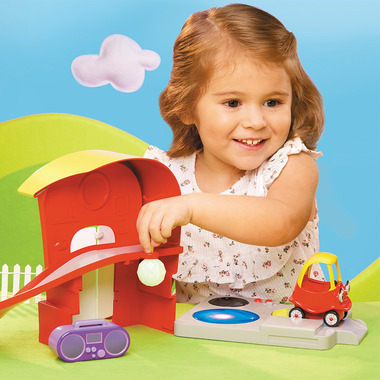 The Let's Go Cozy Coupe Cozy's House is a perfect playset for kids 3 and up and it's a dance party! Have Cozy Coupe slide on down for a good time, or all to the back of the house for a full-blown dance party. Kids can play the hit theme song from Let's Go Cozy Coupe! Invite a few vehicle friends over and make your cars dance on the Magic Dance Floor that lights up, turns, and plays music! Cozy knows it's home sweet home and friends are always welcome! Includes: Cozy Coupe Vehicle, Playset, Magic Dance Floor and Boom Box.
