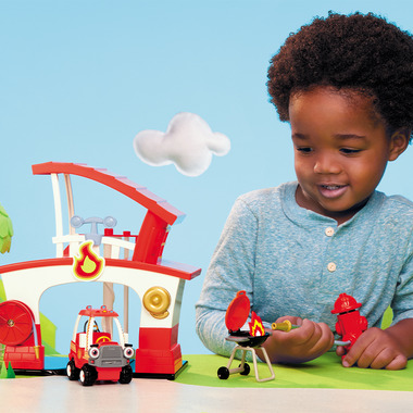 The Let's Go Cozy Coupe Fire Station Playset is a perfect playset for kids 3 and up! It's Hero Time and Cozy Fire Truck is on the scene. Take Cozy Fire Truck up the lookout tower to see where the fire is. Uh oh! There's a fire in the barbecue grill, so slide down the fire pole and use the red fire hydrant with real, water spraying hose to put the fire out. Build your world with many more vehicles and playsets, each sold separately.