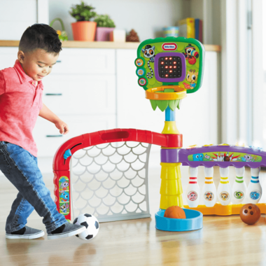 Triple the play with the Little Tikes 3-in-1 Sports Zone! Dunk, kick and score with your child’s 3 favorite sports: basketball, soccer and bowling! Basketball features an adjustable height hoop to grow with your child. The backboard lights up and features over 75 rewarding sounds and phrases that activate when shots are made! Plus, it folds up compactly for easy storage. Ages 1-3.