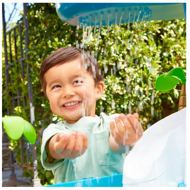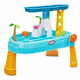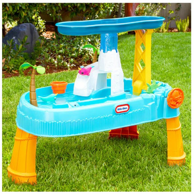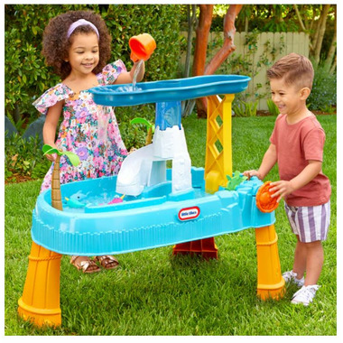The Little Tikes Waterfall Island Water Table lets kids use their imaginations go on an island adventure. This large waterfall water table has multiple activities for several kids to play at once. They can pour water on the top and watch it pour down to the lagoon below. There's a splash slide running down the mountain in the center and a secret cave tunnel for creatures to swim through. It features two palm trees with spinning treetops, a kid-powered spinning wheel for making waves, and includes three sea creatures–two cheerful narwhals and a very friendly shark–a treasure chest and a water scooper.