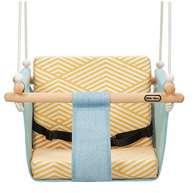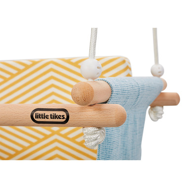 Little Tikes® Wood Rockabye Nature Swing™ features easy set up and easy to clean fabric. The sturdy, real wood swing can be used indoors or outdoors and grows with your child. The height is adjustable thanks to the included straps. There is also an adjustable safety belt. Max Weight: 50 lbs.