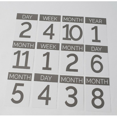 - Milestone set includes cards for 1 to 6 days, 1 to 4 weeks, 1 to 11 & 18 months, and 1 to 2 years
