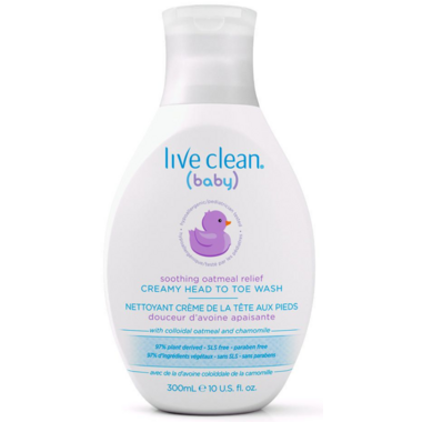 Live Clean Baby Soothing Relief Creamy Head to Toe Wash is a clinically tested, mild, tear-free formula that gently cleanses and helps moisturize baby’s dry skin. Made with natural Colloidal Oatmeal and Chamomile this emollient rich and soothing formula is gentle enough even for babies with sensitive skin.