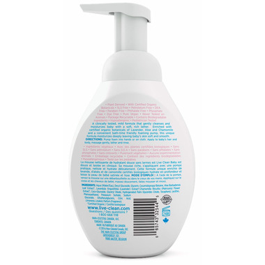 Live Clean Baby Tearless Foaming Wash gently cleanses and moisturize your baby's delicate skin. This mild, tear-free, clinically-tested formula generates a soft, rich lather infused with certified organic chamomile, lavender and aloe. Live Clean Baby Tearless Foaming Wash comes in a convenient foaming pump dispenser for stress-free bath time.