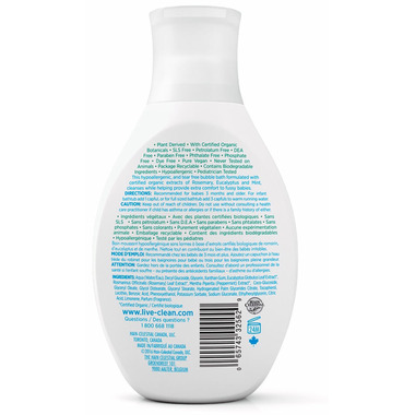 This Live Clean Baby Soothing Vapour Bubble Bath & Wash is a clinically tested, hypoallergenic and tear free gentle bubble bath and wash that gently cleanses and moisturizes while helping provide extra comfort to babies with colds and congestion. Formulated with natural essential oils of Rosemary, Eucalyptus and Menthol, recognized and trusted for their soothing aromatherapy properties.