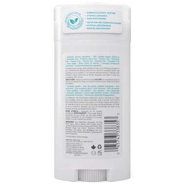Clinically proven all day odour protection that is non-whitening and goes on dry. Combined with Baking Soda and Corn Starch to neutralize odours and soothing Aloe & Vitamin E, this naturally derived formula is blended with Certified Organic Botanicals of Parsley, Rosemary and Sage to leave you confidently fresh all day.