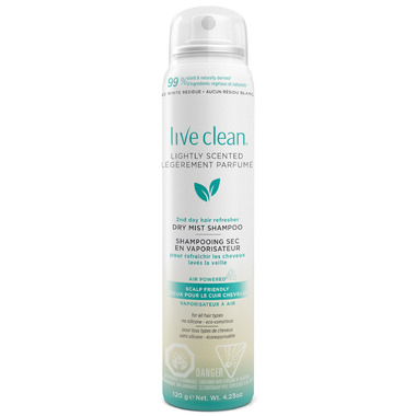 Live Clean Lightly Scented Dry Mist Shampoo refreshes and revives your hair on those non-wash days or anytime you want your hair to look fresh and clean. Specially formulated to neutralize odours, revitalize and add bounce to your hair. Clear, scalp-friendly formula with NO white residue to clog pores.