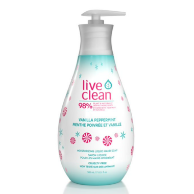 Celebrate the joyful spirit of the holidays this season with Live Clean's Holiday inspired Vanilla Peppermint fragrance  hand soaps. Gently cleanse, hydrate and restore moisture balance and luster to dry hands. Made with naturally derived and biodegradable ingredients, leave hands clean and soft.