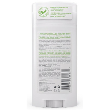 Clinically proven all day odour protection that is non-whitening and goes on dry. Combined with Baking Soda and Corn Starch to neutralize odours and soothing Aloe & Vitamin E, this naturally derived formula is blended with Certified Organic Botanicals of Parsley, Rosemary and Sage to leave you confidently fresh all day.