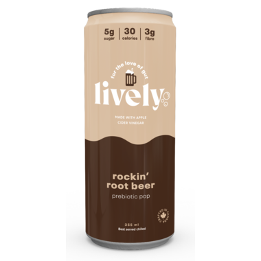 - Lively Rockin Rootbeer Prebiotic Pop, for the love of gut. Made with apple cider vinegar.