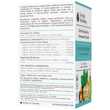 Medicinal Ingredients: Per Serving Size (two capsules) SymbioTM Fermented Herbal Blend 266mg Organic Baobab (fruit), Organic Maca (root), Organic Beetroot 26.6mg (root), Organic Spinach (leaf) Organic Turmeric (rhizome) Organic Chaga Mushroom (fruiting body) 133mg Organic Herbal Blend 400mg Organic Alfalfa Leaf, Organic Fennel Seed, Organic Nettle Leaf, Organic Parsley Leaf Non-Medicinal Ingredients: Ferment Media (Kefir and Kombucha Symbiotic Culture and lactic acid bacteria [L.brevis, L.pentosus, L.plantarum, L.paracasei]), Organic pullulan capsule (Organic pullulan starch, water).