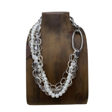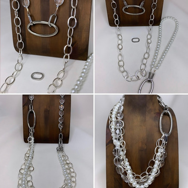 This combination will take you around the world and back again. It includes our silver Aidan chain (39 long) clear oval crystal strand plus a white glass pearl strand. Paired with two sizes of our Silver Oval HardWear.