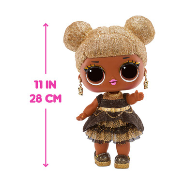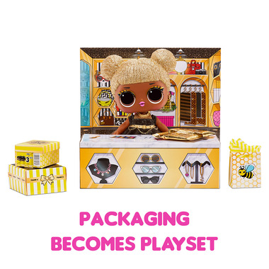 Welcome 2 the ultimate Big B.B. channel! She got back from a shopping spree & can't wait 2 share what she got! Join her as she unboxes all her fashion finds & cre8s new looks! Introducing LOL Surprise Big B.B. (Big Baby), a BIG version of a fan favorite character with real fashions and cute accessories to unbox. Queen Bee now comes in a BIG size (11 inches tall), and she's totally posable. Her package becomes an unboxing station playset. Set up her included table, chair and backdrop to create the perfect setting to unbox. Then, help Queen Bee unbox all her fashion finds, including a jacket, skirt, shoes, backpack and more from cute packages. She even has sweet earrings that are wear and share. Put them on her, or add the included attachments, so you can wear them, too! Check out Big Baby MC Swag and Big Baby Bon Bon to complete the collection.