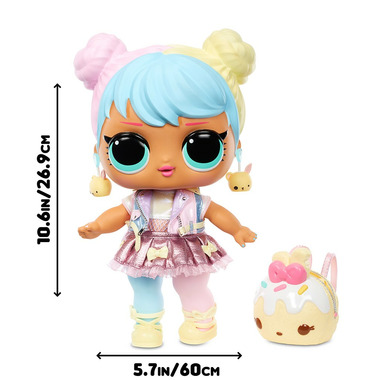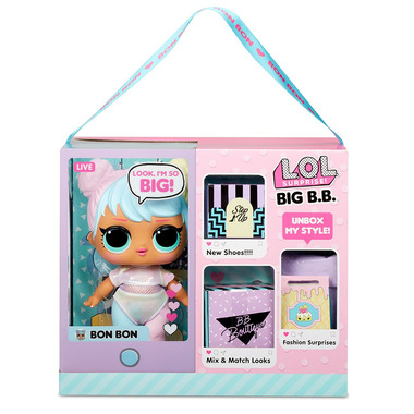 Introducing L.O.L. Surprise! Big B.B. (Big Baby), a BIG version of a fan favorite character with real fashions and cute accessories to unbox. Bon Bon now comes in a BIG size (11 inches tall), and she's totally posable. Her package becomes an unboxing station playset. Set up her included table, chair and backdrop to create the perfect setting to unbox. Then, help her unbox all her fashion finds, including a jacket, skirt, shoes, backpack and more from cute packages. She even has sweet earrings that are wear and share. Put them on her, or add the included attachments, so you can wear them, too!