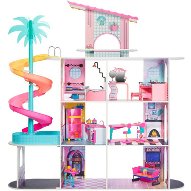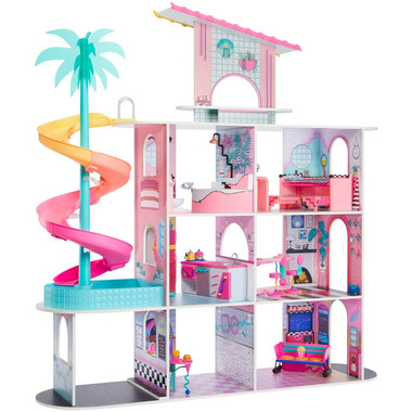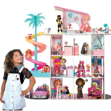 • INTRODUCING the beautiful new L.O.L. Surprise O.M.G. Fashion House! Made from real sustainable wood, this house measures 4 feet tall by 4 feet wide featuring 4 stories and 9 play areas including a living room, pool, rooftop patio, diner, and more!