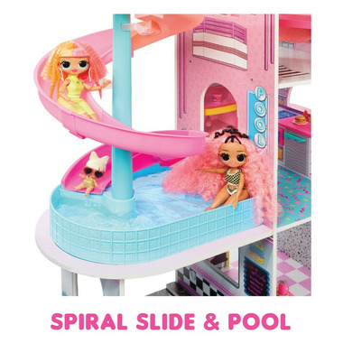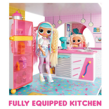 Meet up with your BFF's to create unforgettable memories together at the beautiful new L.O.L. Surprise O.M.G. Fashion House including 85+ Surprises! Made from real sustainable wood, this house measures 4 feet tall by 4 feet wide featuring 4 stories and 9 play areas including a fully equipped kitchen, pool, rooftop patio, diner, and more! Hop right into the living room on the first floor featuring a movie theatre area to watch your favourite movies with your BFF's, an arcade station, and a transforming sofa that can be flipped and used on both sides. If your dolls are looking for a quick snack, head over to the diner right next door to grab a drink or pick up food through the drive-thru window. The second floor includes a fully equipped kitchen cabinet including a microwave, dishwasher, sink, and a stove along with an adorable pink fridge fully stocked with food accessories for endless play. Don’t forget to check out the breakfast bar next to the kitchen where the dolls can enjoy their food while sitting on the bar stools. Clean and wash up your dolls in the third-floor bathroom featuring a toilet, bathtub, shower head, and two racks to hang your dolls’ towels! Next door is the bedroom including a stylish vanity table with drawers and mirrors and a loft bed with blankets and pillows for your O.M.G. and Tweens Fashion dolls and Tots dolls to rest up in. Enjoy the outside rooftop patio where all your dolls can chat around the firepit area and also access the colorful 2-story water slide that leads them directly to the pool. For even more fun, pour water into the pool and enjoy the summer heat with your fabulous dolls. The L.O.L. Fashion House fits L.O.L. Surprise dolls of all sizes including O.M.G. and Tweens Fashion dolls and L.O.L. Tots Dolls.