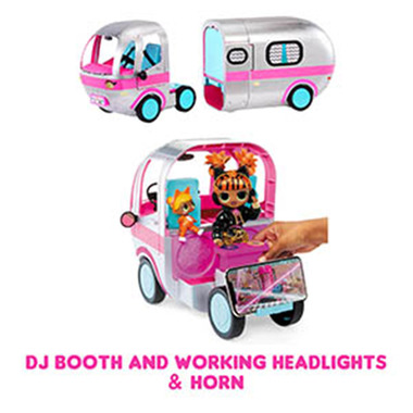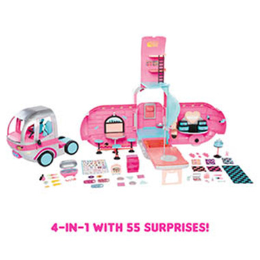 - 4-IN-1 GLAMPER extends up to 2 feet tall and 3 feet wide with over 10 outrageous hangouts to choose from. Detach the front and it becomes a cute car. It has adjustable features that fits all LOL Surprise dolls and OMG fashion dolls.