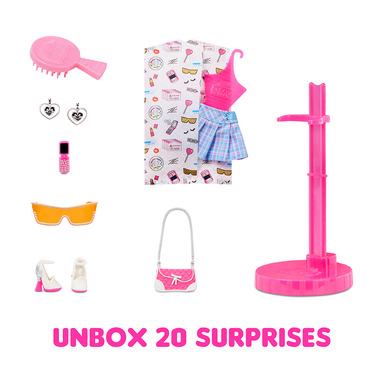• UNBOX 20 SURPRISES including a fashion doll, 2 fabulous ensembles, shoes, accessories, hairbrush, and doll stand in an all-new unboxing experience.