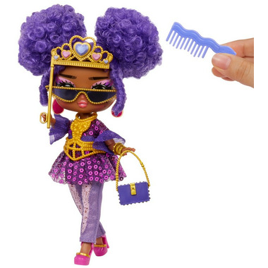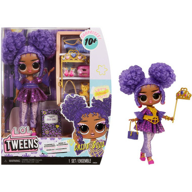 L.O.L. Surprise Tweens Core Doll - Cassie Cool I'm in Be Tween, but right where I wanna be. Full of surprises & unique style. Look out world, cuz here I come. Introducing the all-new L.O.L. Surprise Tweens fashion doll Cassie Cool, a rock star in the making! Unbox 10+ surprises and get to know Cassie Cool, with her ear to the beat and her style made for the stage, she's always coming up with the coolest new lyrics. Cassie Cool has star power and the confidence to back it! She loves to jam out and dress all in purple in her glamorous dress with her pearl body chain and lace designed pants! She reps her love for purple in everything she wears including her purple studded purse and crystal sunglasses! Her outfit also includes fabulous shoes, droplet-shaped earrings, and a princess crown prop! She also has an adorable throwback CD player to listen to all her favourite albums. She has stunning features, beautiful purple hair she loves to wear in stylish buns, her own fabulous style, and comes articulated for tons of posing opportunities. Each box includes a L.O.L. Surprise Tweens fashion doll, unique fashions, shoes, purse, sunglasses, accessories, CD player, princess crown prop, hairbrush, and doll stand. Collect all L.O.L. Surprise Tweens fashion dolls: Ellie Fly, Hana Groove, Flora Moon, and Cassie Cool! L.O.L. Surprise fashion dolls with stylish hair, outfits and many detailed accessory pieces make a perfect toy for kids, including 4 years old and up for imaginative pretend play! As gifts for any special occasion, dolls provide hours of social play with siblings and friends! From MGA Entertainment, creators of L.O.L. Surprise fashion and collectible dolls, Rainbow High fashion dolls, Na Na Na Surprise dolls, Bratz fashion dolls, MGA's Dream Ella, MGA's Glitter Babyzٙ, Lalaloopsy, Baby Born Surprise baby dolls and collectibles, Little Tikes kids' toys and many other favourite brands.