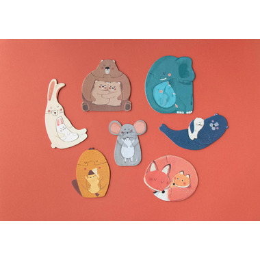 Give me a hug! Assemble the puzzles and match each baby with its mother. Puzzles for the youngest members of the family. After assembling the puzzles of the big animals, they will be able to fit the small animals together. 7 puzzles of 3 large pieces with illustrations of different animals hugging their babies.