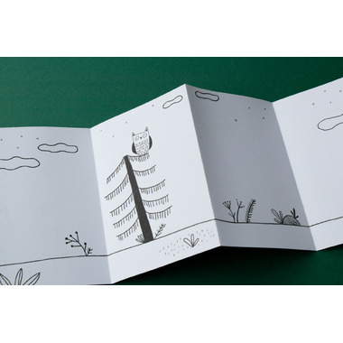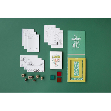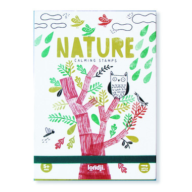 Relax by stamping repeating patterns of trunks, leaves and birds and create your very own natural landscape! The game includes 6 wooden stamps, 9 fold-out sheets and inks in 3 colours. For children aged 5 and over.
