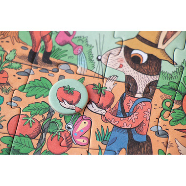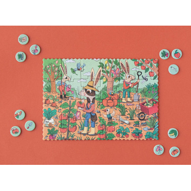 These rabbit friends grow strawberries, lettuce, watermelons, pears, and many more delicious fruits and vegetables. Once the puzzle is assembled, have fun finding all the details of their garden! A small 24-piece puzzle that includes 12 observation pieces to learn about the garden, fruits, and vegetables! A pocket-sized puzzle to take anywhere.