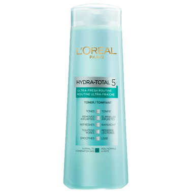L’Oréal Paris laboratories created Hydra-Total 5 Ultra-Fresh routine, designed specifically for normal to combination skin. The Ultra-Fresh Toner removes impurities and tightens pores in oily-prone areas for fresh-feeling skin that is toned. Skin stays clean and complexion looks fresh. Skin remains visibly soft, smooth and even.