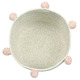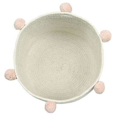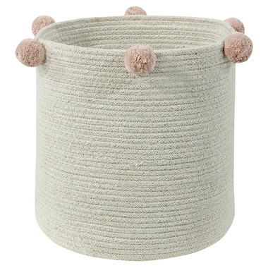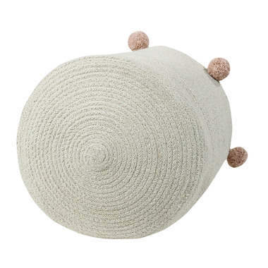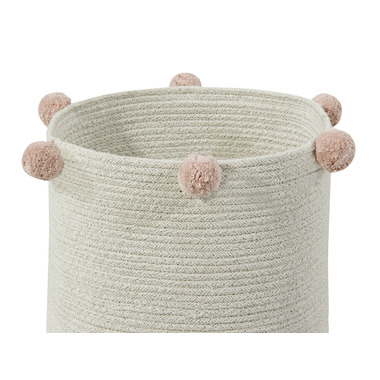 Braided cotton basket with circular base, in natural colour and nude cotton balls on the top of the basket.