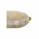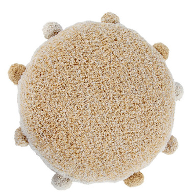 Soft round-shaped floor cushion, in Natural and Honey melange colors, with 9 soft cotton pom poms in matching colors attached around edges.