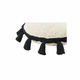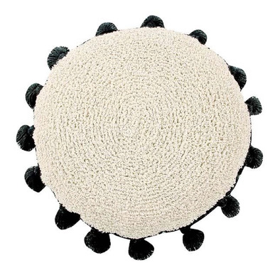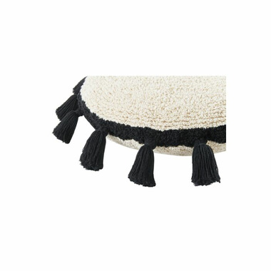 Filled washable round cushion with base in Natural colour using loop technique and Black tassels all around.