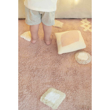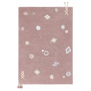Washable rug in soft Nude Vintage tones with three handmade braids on one side and two pom-poms on the other. A blink to the most classic collection of Lorena Canals.Its details of bereber, polka dots, tassels, and impressive braids make it unique. This rug is the perfect host of this pyjama party collection! Size: 4' 7'' x 6' 7''