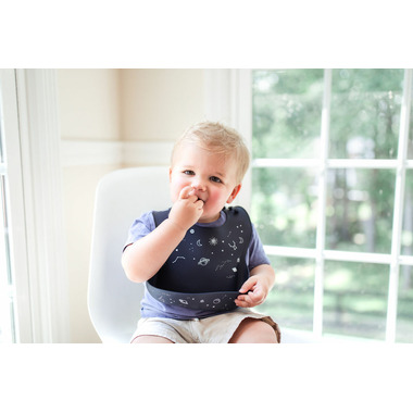 A molded, catch-all pouch and easy, wipe-down surface makes for quick cleaning. With reinforced buttonholes for a durable, adjustable fit, this handy bib is available in an array of modern colours and fresh designs to complement baby's wardrobe. Let's hear it for less laundry!
