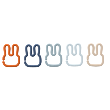 Loulou Lollipop's multi-functional silicone bunny links are ideal for attaching toys and teethers to the stroller, play gym, carrier, or car seat. These five colorful links can be linked together, stacked up, and taken with you wherever you go - helping keep baby's favorite items off the floor while providing hours of entertainment. Crafted from food-grade silicone, they're easy for little hands to hold and explore. A pack of 5 links in the adorable Bunny shape. Made with food-grade silicone and durable nylon inserts. Use it for babies' favorite toys or as teethers.