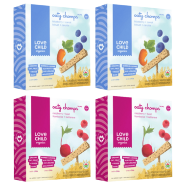 Love Child Organics Beets & Raspberry Oaty Chomps Ingredients: Organic oats, organic dates (paste, organic raisins, organic sunflower oil, organic apples, organic chia seeds, organic raspberries, organic beet powder, organic tapioca flour, organic raspberry flavour.