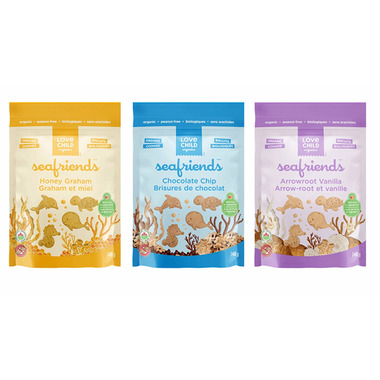 Love Child Organics Seafriends Honey Graham Ingredients: Enriched wheat flour*, Sugars (cane sugar*, invert cane sugar syrup*, honey*), Graham flour*, Palm oil* (sustainable), Rolled oats*, Flavours*, Sea salt, Baking soda, Ammonium bicarbonate, Soy lecithin*, Apple powder*, Banana powder*, Sweet potato powder*, Broccoli powder*, Spinach powder*, Rice flour*. *Organic.