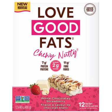 NEW Love Good Fats Chewy Nutty fruit bars embrace a whole new way of eating! They’re ridiculously delicious and have only 2g of sugar and are loaded with good fats. Finally, a crunchy, delicious bar with real nuts & fruits that aren’t loaded with all the sugar and are made with tons of good stuff. This White Chocolatey Strawberry bar is the first to bring such a deliciously sweet flavour to the table…without all the sugar!