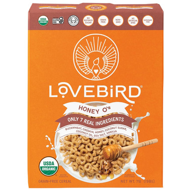 Lovebird Organic Grain-Free Cereal Honey. Fair Trade Cassava, Honey, Coconut Sugar, Coconut Oil, Sea Salt, Vanilla