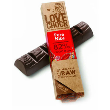 LoveChock Cacao Nibs Raw Organic Dark Chocolate Bar is a full bodied, pure bar with crunchy pieces of cacao bean.