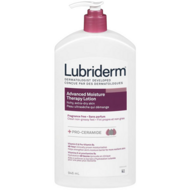 Lubriderm Advanced Moisture Therapy Lotion is a therapeutic daily lotion that is specially designed to keep extra-dry skin feeling hydrated and healthy. The moisturizing lotion is enriched with Vitamin E, Pro-Vitamin B5, and pro-ceramide. The Vitamin E and Pro-Vitamin B5 help soothe dry, itchy skin and improve softness and elasticity by giving it the hydration it needs every day. The pro-ceramide helps protect the skin's barrier and helps skin to retain its moisture levels. This moisturizer has a unique formula that deeply replenishes and moisturizes dry skin. This daily lotion is clinically proven to moisturize your skin for a full 48 hours to help you develop, replenish, and maintain healthy-looking skin. The creamy formula absorbs quickly, so it feels clean and comfortable on skin, never heavy or greasy. Perfect for smoothing over hands and entire body morning and night, Lubriderm Advanced Moisture Therapy Lotion leaves skin feeling soothed and replenished.