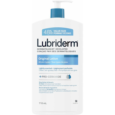 Lubriderm Original Body Lotion is a solution to replenish and moisturize dry skin that the whole family will love. Fortified with Vitamin B5 and skin essential moisturizers, this clean feeling, non-greasy everyday lotion absorbs in seconds and is clinically shown to moisturize for 24 hours.