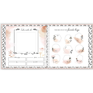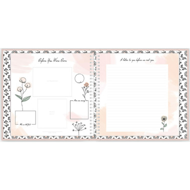 Luxurious Memory Baby Book with exquisite gold embossed fabric cover. Wildflower Meadow Luxury Memory Baby Book captures each darling moment before you meet up until their fifth birthday allowing you to cherish all of babies memories as they grow. Beautiful illustrations enhance each collected moment, creating a unique story to enjoy together for years to come. The Wildflower Meadow theme compliments babies' journey with its intricate florals and delicate color palette. Perfect for you, or as a gift to easily record and enjoy your forever memories.