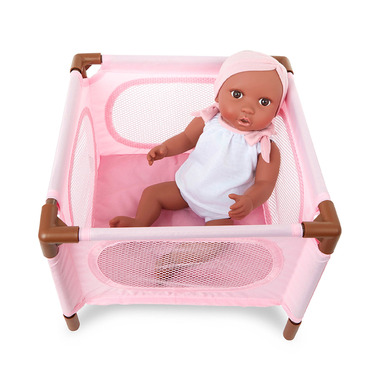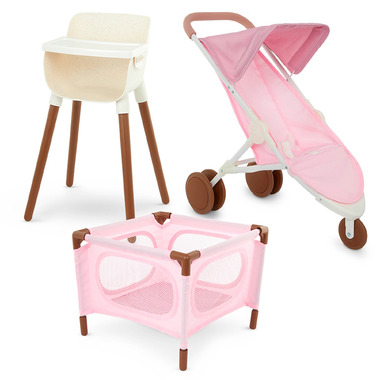 A 3-in-1 nursery set for your Babi doll. Give babi dolls a lovely place to dream and play with the babi doll nursery playset, including a portable playpen, cute high chair, and jogger stroller. Modern pink playpen perfectly sized to keep dolls bedside during the night. Seat a Babi doll in the high chair to enjoy yummy meals after their nap. Take them on fun trips in the jogger stroller! Secure them with the safety strap and keep them comfy with the foldable canopy.