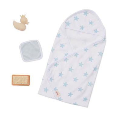 It's been a long day and there's nothing like a good bath to relax! Baby can play in the bath with his little duck. A soft washcloth and a brush will wash his delicate skin well. When your baby gets out of the bath, wrap him in the hooded towel. He'll be comfortable and warm!