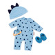 It's getting late, it's time to go to bed! Baby puts on a comfortable blue night-time outfit with star print. For added comfort, put on baby's beanie and slippers and let sleep take over his pretty eyes!