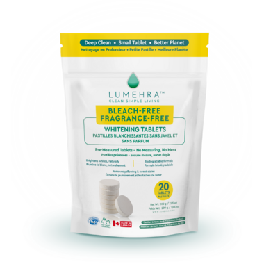 Lumehra Fragrance-Free Bleach-Free Whitening Tablets Bright Whites. Safe Clean. Proudly Made in Canada. Lumehras Fragrance-Free Bleach-Free Whitening Tablets are formulated with plant- and mineral-based ingredients to lift stains, remove dullness, and restore brightness to white fabrics, all without chlorine bleach, harsh chemicals, or fragrance. For best results, use together with Lumehras Fragrance-Free Laundry Detergent Tablets to achieve a deeper, brighter clean. Why Families Choose Lumehra Lumehra's Bleach-Free Whitening Tablets give families a natural, effective way to keep whites brilliant, clean, and fresh without bleach or damage. Big Clean. Small Tablet. Better Planet.