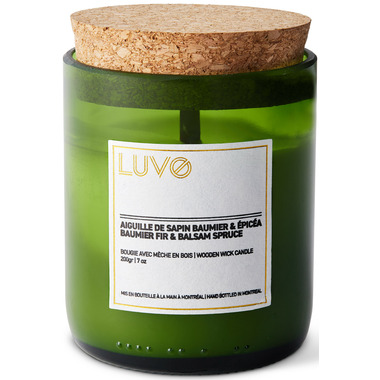 LUVOs Scented Candle is poured into a wine bottle, topped with a cork lid for a natural touch. A wooden wick crackles gently as it burns, while a coconut wax blend delivers a smooth, strong scent throw. Fragrances are crafted in Grasse, France, bringing luxury to every light. At 200g, it burns for about 50 hours.