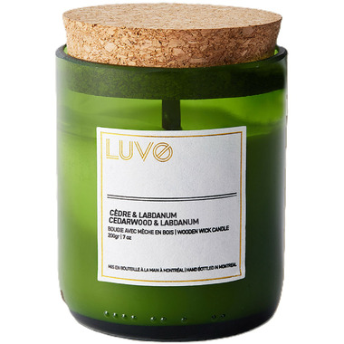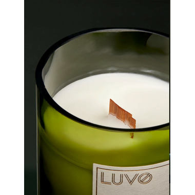 LUVOs Scented Candle is poured into a wine bottle, topped with a cork lid for a natural touch. A wooden wick crackles gently as it burns, while a coconut wax blend delivers a smooth, strong scent throw. Fragrances are crafted in Grasse, France, bringing luxury to every light. At 200g, it burns for about 50 hours.