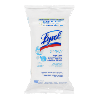 New Lysol Simply multi-purpose cleaning Wipes are made with plant based lactic acid for a safe and effective clean. Lysol Simply eliminates bacteria and leaves no harsh chemical residue behind. It has no dyes, no ammonia and is bleach free! Lysol Simply is available in a brand new lightly scented fragrance.