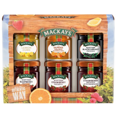 42g preserves: 1 x Lemon Curd, 1 x Dundee Orange Marmalade, 1 x Scottish Blackcurrant Preserve, 1 x Scottish Raspberry Preserve, 1 x Scottish Strawberry Preserve and 1 x Strawberry Preserve with Champagne.